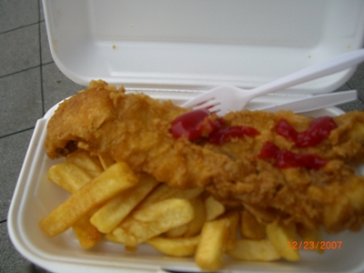 みなさん意気揚々と滑ってらっしゃるのを遠めに見つつ、自分は昼食。大好きなEAT(コーヒー屋さん)でコーヒーとサンドイッチを購入したにも関わらず、少し歩いたら「Fish&Chips」の文字が!これって街中ではパブでしか見かけなくてまだ食べてなかったのです。初のFish&ChipsをGet!
