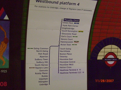 あとは、学校近くのピカデリーの駅。見えにくいですが、行き先が枝分かれになっていて、私が乗るほうにヒースロー空港行きがあります。ピカデリーラインと言います。学校に行くときはもう1つ先のレスターという所で降りますが、私はピカデリーが好きでよくここから乗ります。